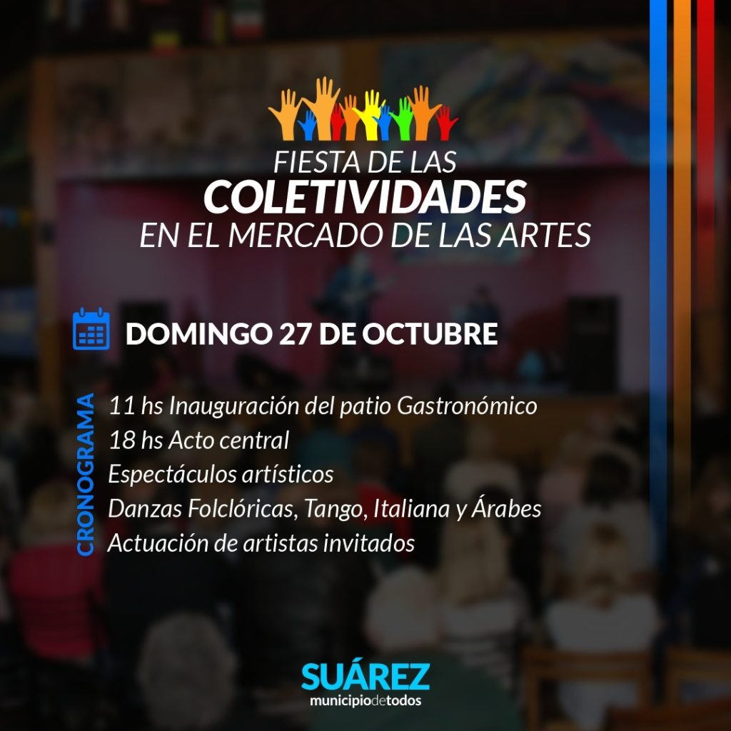 Vuelve la Fiesta de las Colectividades al Mercado de las Artes! Este domingo 27 de octubre, te invitamos a celebrar la diversidad y las tradiciones que enriquecen nuestra cultura suarense. Entrada libre y gratuita.
