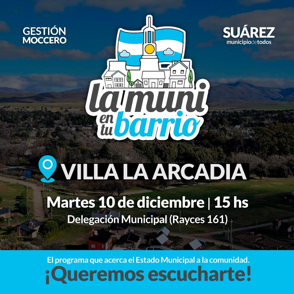 “La Muni en tu Barrio” en Villa La Arcadia. El programa que acerca el Estado Municipal a la comunidad. ¡Queremos escucharte! el martes 10 de diciembre, 15 horas en la delegación municipal -Rayces 161-.