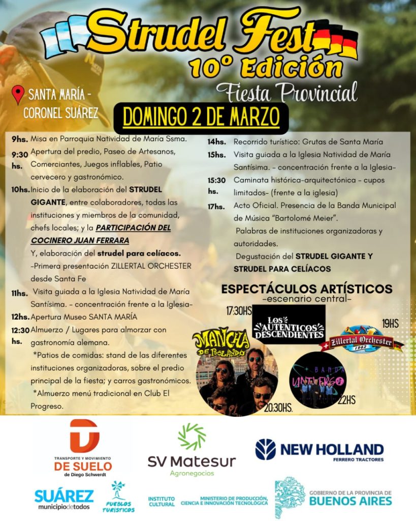 La Strudel Fest ya tiene su grilla de espectáculos confirmada, y es imperdible. La fiesta que mantiene viva la cultura, las tradiciones de los Alemanes del Volga se llevará a cabo del 28 de febrero al 2 de marzo en Pueblo Santa María.