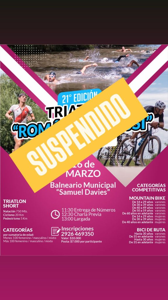 Suspensión triatlón Román Collosi 2025. La Dirección de Deportes del Municipio de Coronel Suárez informa que, debido al temporal que azotó nuestro distrito y la región, y por cuestiones de seguridad en el predio del Balneario Municipal, se dicidió suspender el Triatlón Román Collosi 2025. Lamentamos los inconvenientes y agradecemos la comprensión de todos los participantes y la comunidad.