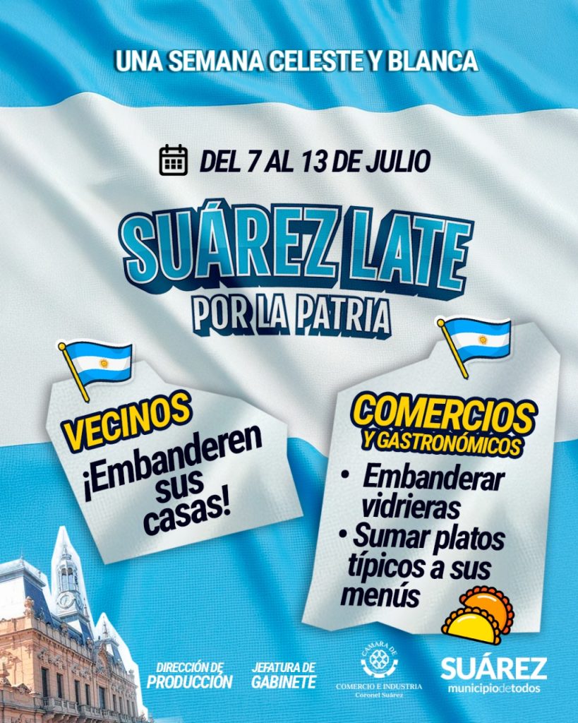 “Una Semana Celeste y Blanca: Suárez late por la Patria”. En el marco de los festejos por un nuevo aniversario de la Independencia Nacional, la Gestión de Gobierno Municipal –a través de la Jefatura de Gabinete y la Dirección de Producción– junto a la Cámara de Comercio de Coronel Suárez, invita a vivir del 7 al 13 de julio una semana cargada de orgullo patrio, historia e identidad nacional. La propuesta busca embellecer la ciudad con los colores celeste y blanco, reforzando el sentimiento patriótico que nos une como comunidad.