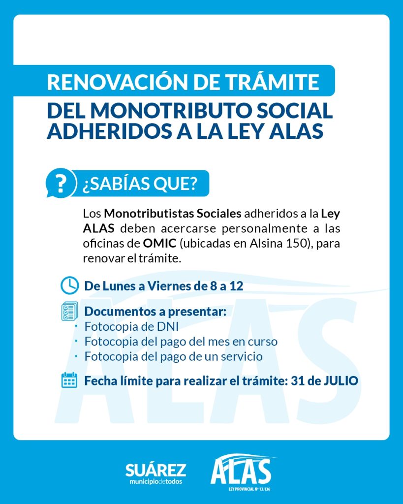 Información para monotributistas sociales. Se informa a los Monotributistas Sociales adheridos a la Ley ALAS que deben acercarse personalmente a las oficinas de OMIC-ubicadas en Alsina 150-, para renovar el trámite.