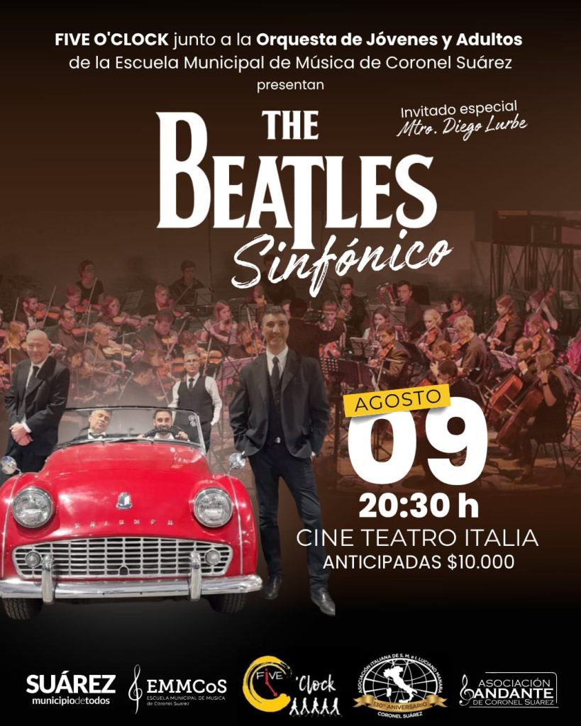 El show contará con la participación especial de Five O’Clock, que interpretará en vivo los clásicos de The Beatles, acompañada por una formación sinfónica que brindará un marco sonoro imponente, emotivo y de alta calidad. El Maestro Diego Lurbe será el director invitado de la velada, consolidando así un reencuentro muy esperado por la comunidad suarense.