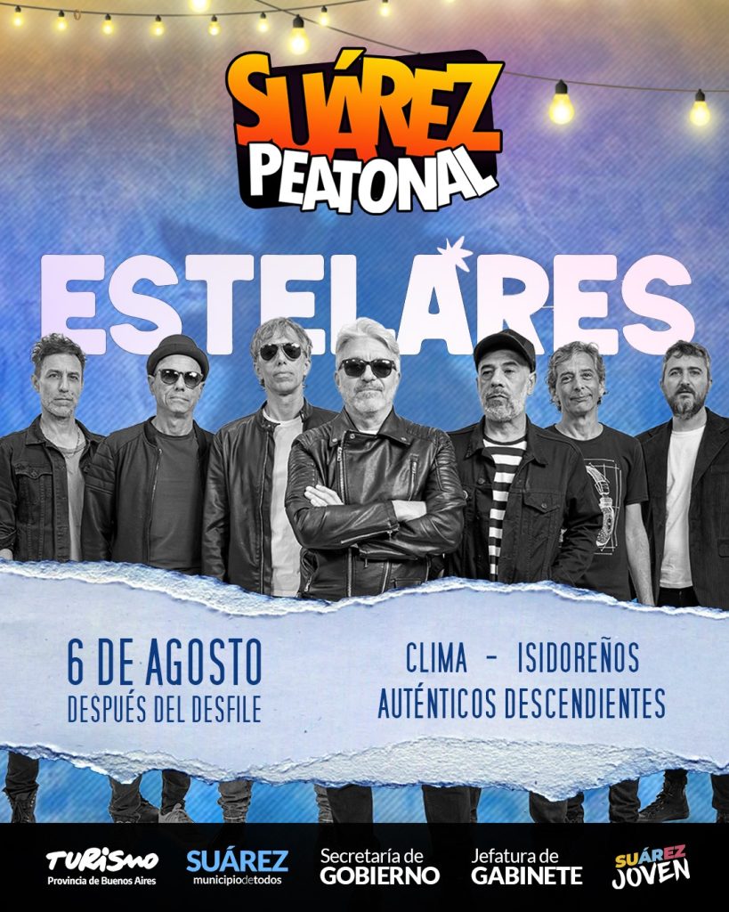 La banda Estelares llega a Suárez con sus clásicos “Un día perfecto”, “Aire”, “Ella dijo” y “El corazón sobre todo”, presentando además su nuevo disco “Los Lobos”. Una propuesta que sin dudas generará una gran movida regional, posicionando a Coronel Suárez como epicentro cultural del sudoeste bonaerense. Junto a ellos, subirán al escenario nuestros artistas locales que con talento, pasión y compromiso son reconocidos y queridos por su pueblo: