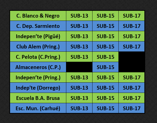 Participarán los representativos suarenses de Blanco & Negro y Dep. Sarmiento, Alem de C. Pringles, Independiente de Pigüé, Almaceneros de C. Pringles, Independiente de Dorrego, Independiente de C. Pringles, Escuela B. Brusa de C. Dorrego y Club de Pelota de C. Pringles.