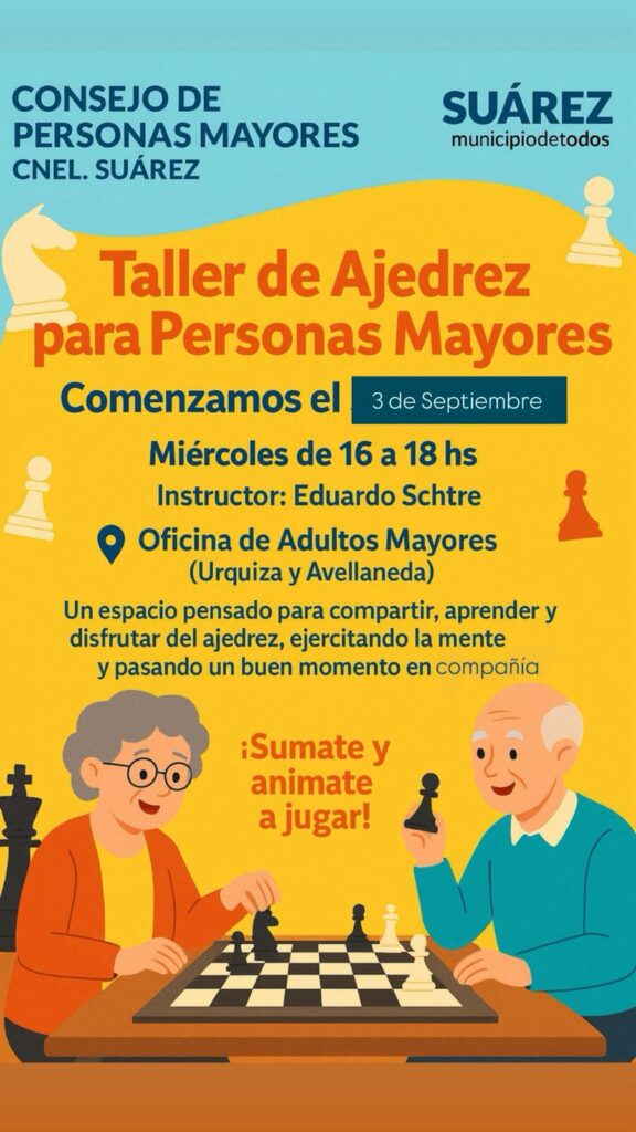 Nuevo Taller de Ajedrez para Personas Mayores. El Consejo de Personas Mayores invita a participar del Taller de Ajedrez para Personas Mayores, un espacio pensado para compartir, aprender y disfrutar de este apasionante juego mientras ejercitamos la mente y pasamos un lindo momento en compañía.