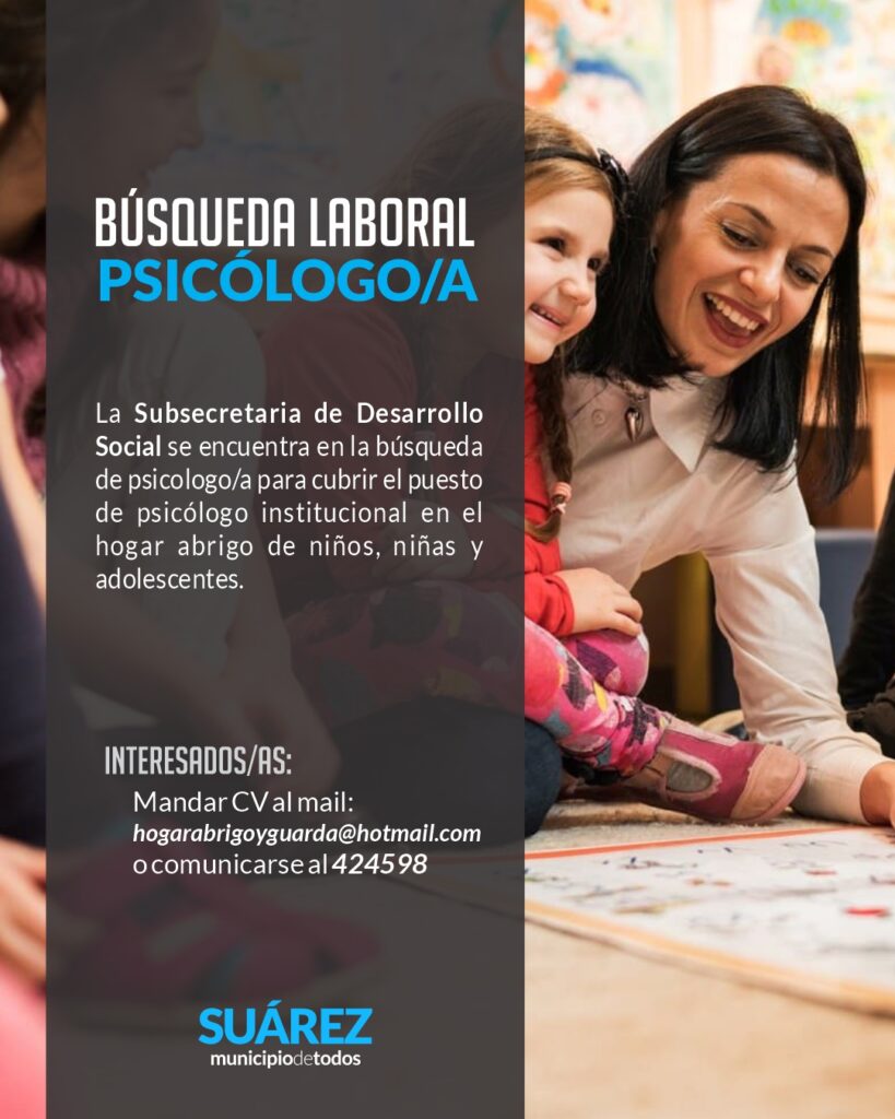 Búsqueda laboral Psicólogo. La Subsecretaria de Desarrollo Social se encuentra en la búsqueda de psicologo/a para cubrir el puesto de psicólogo institucional en el hogar abrigo de niños, niñas y adolescentes. Interesados mandar cv al mail hogarabrigoyguarda@hotmail.com o comunicarse al telefono 424598. / Municipio de C. Suárez