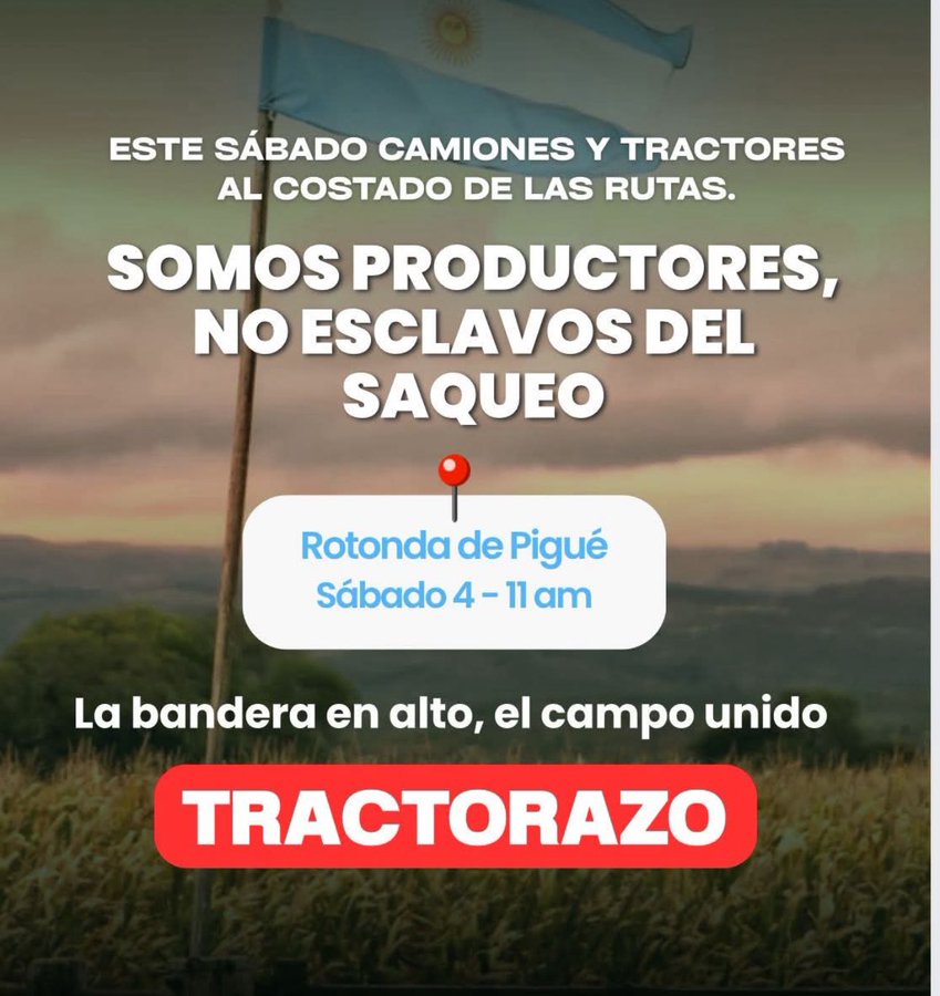 Llaman a un “tractorazo”contra la “estafa” de las retenciones cero de Javier Milei. Comenzaron a circular convocatorias a productores y transportistas bonaerenses para manifestarse a la vera de la ruta. Bajo la consigna “Somos productores, no esclavos del saqueo” comenzaron a circular en redes sociales una serie de convocatorias de “tractorazos” contra el fin de las retenciones cero a los granos.