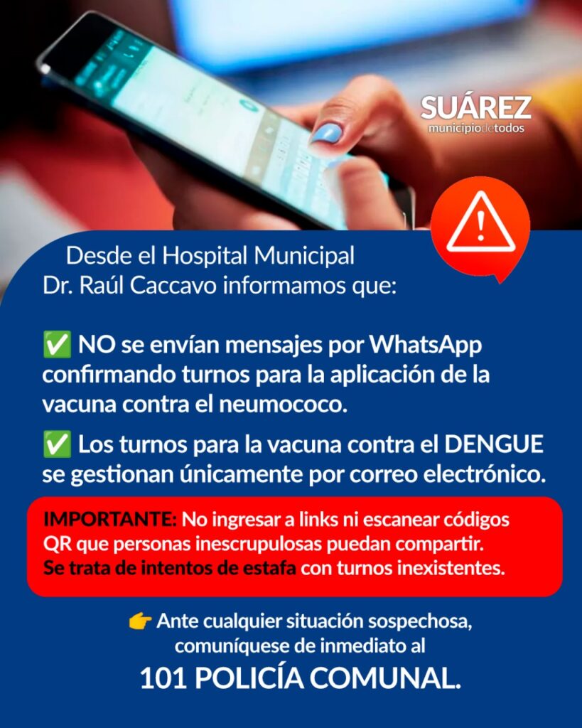 Atención vecinos de Coronel Suárez: desde el Hospital Municipal Dr. Raúl Caccavo informamos que: no se envían mensajes por WhatsApp confirmando turnos para la aplicación de la vacuna contra el neumococo. Los turnos para la vacuna contra el dengue se gestionan únicamente por correo electrónico.