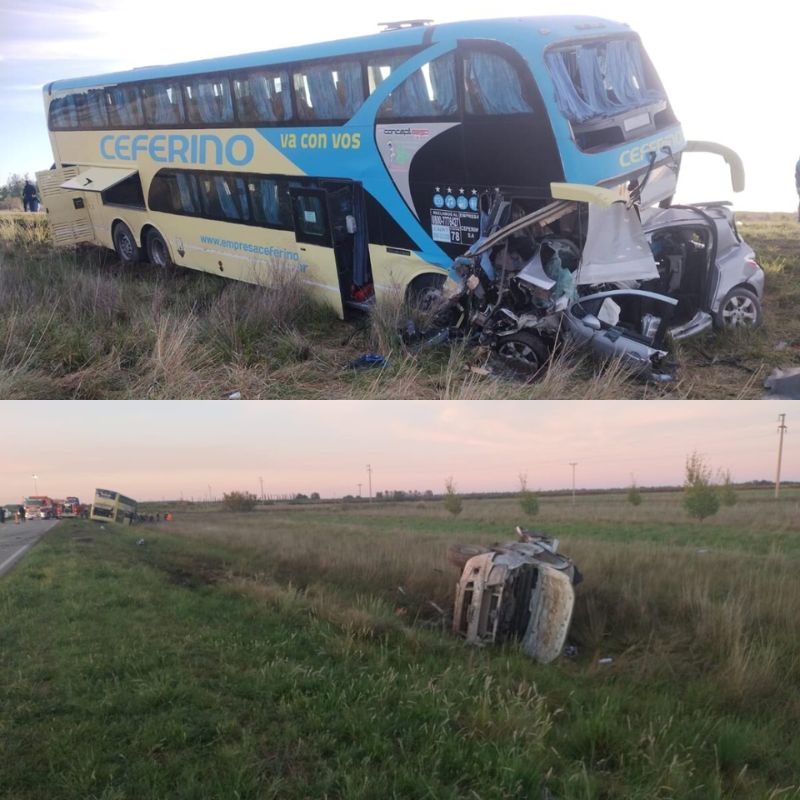 Por causas que aún se investigan, colisionaron un colectivo de la empresa Ceferino, una camioneta Ford Ranger y un automóvil Peugeot 307. El colectivo, que circulaba en sentido Bahía Blanca – Viedma, era conducido por Luis Carlos Almirón, de 38 años y oriundo de Viedma. El chofer resultó herido y fue trasladado al hospital local. No se brindaron precisiones sobre el estado de los pasajeros, quienes también sufrieron lesiones de diversa consideración.