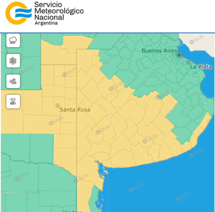 También se encuentra vigente una alerta amarilla por vientos del sector norte, con velocidades sostenidas de 35 a 50 km/h, y ráfagas que podrían alcanzar los 75 km/h.