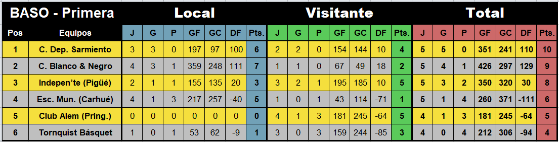 El básquetbol formativo del Básquet Asociación del Sudoeste (BASO) dio continuidad a las acciones este sábado con la disputa de la sexta fecha del Clausura 2025 en sus tres líneas formativas por puntos. No se incluyen datos de la categoría sub-11 al no ser competitiva y no disputarse la totalidad de partidos. Trece cotejos se jugaron desde la sub-13 a la sub-17 y el balance de todo lo acontecido en cuanto a resultados, tablas de posiciones finales y próxima fecha, lo tenés aqui, en este resumen único de ECOS.