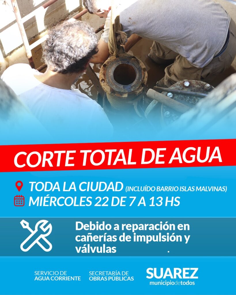 Corte total de agua este miercoles 22 de 7 a 13 hs. La Secretaría de Obras Públicas informa que este miercoles 22, de 7 a 13 hs, se interrumpirá por completo el suministro de agua corriente en toda la ciudad y el barrio Islas Malvinas.