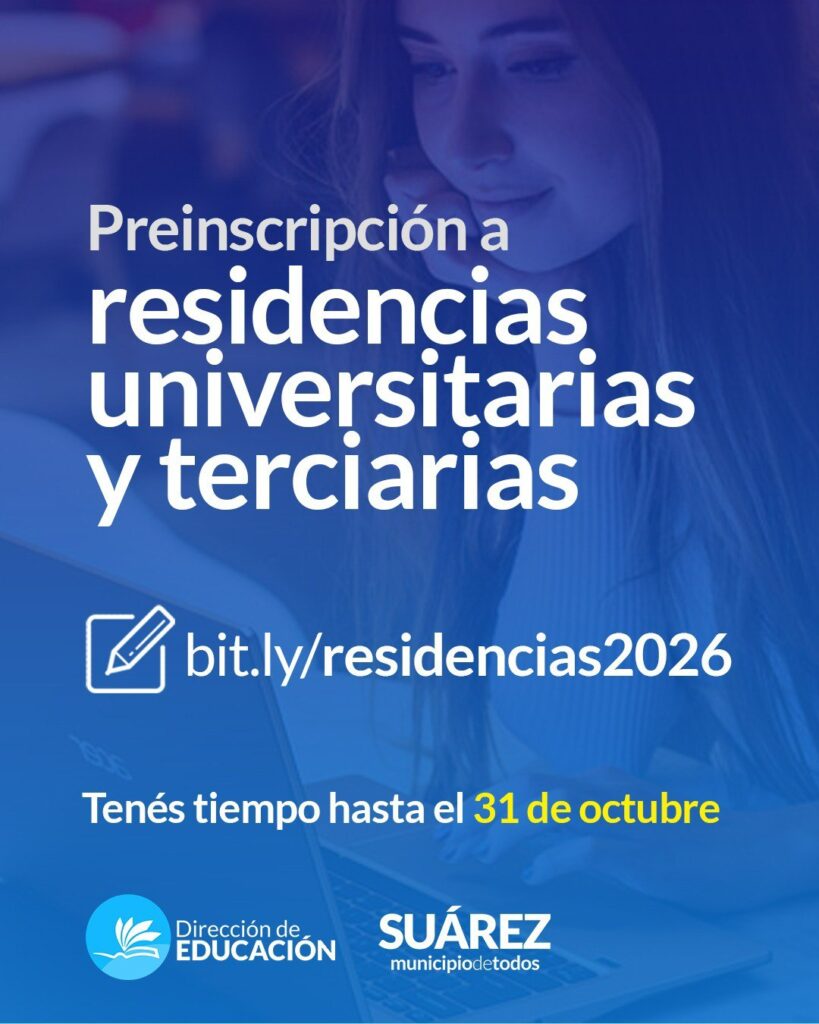 Convocatoria a inscripción para las Residencias Municipales. La Dirección de Educación, informa que, hasta el 31 de octubre, se encuentra abierta la pre-inscripción a las Residencias Municipales en las ciudades de Buenos Aires, La Plata, Bahía Blanca y Coronel Suárez.