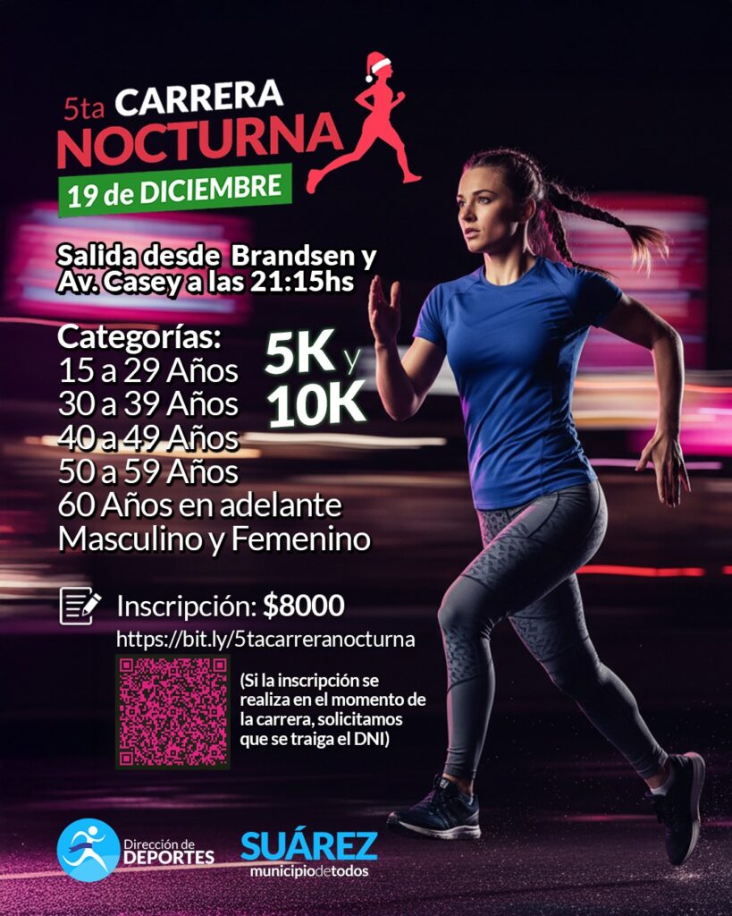 Organizada por la dirección de Deportes del Municipio de Coronel Suárez y por quinto año consecutivo, te invitamos a sumarte a la gran noche del deporte en Coronel Suárez con circuitos de 5 km y 10 km para cerrar el año y recibir el 2026 ¡con toda la actitud! .