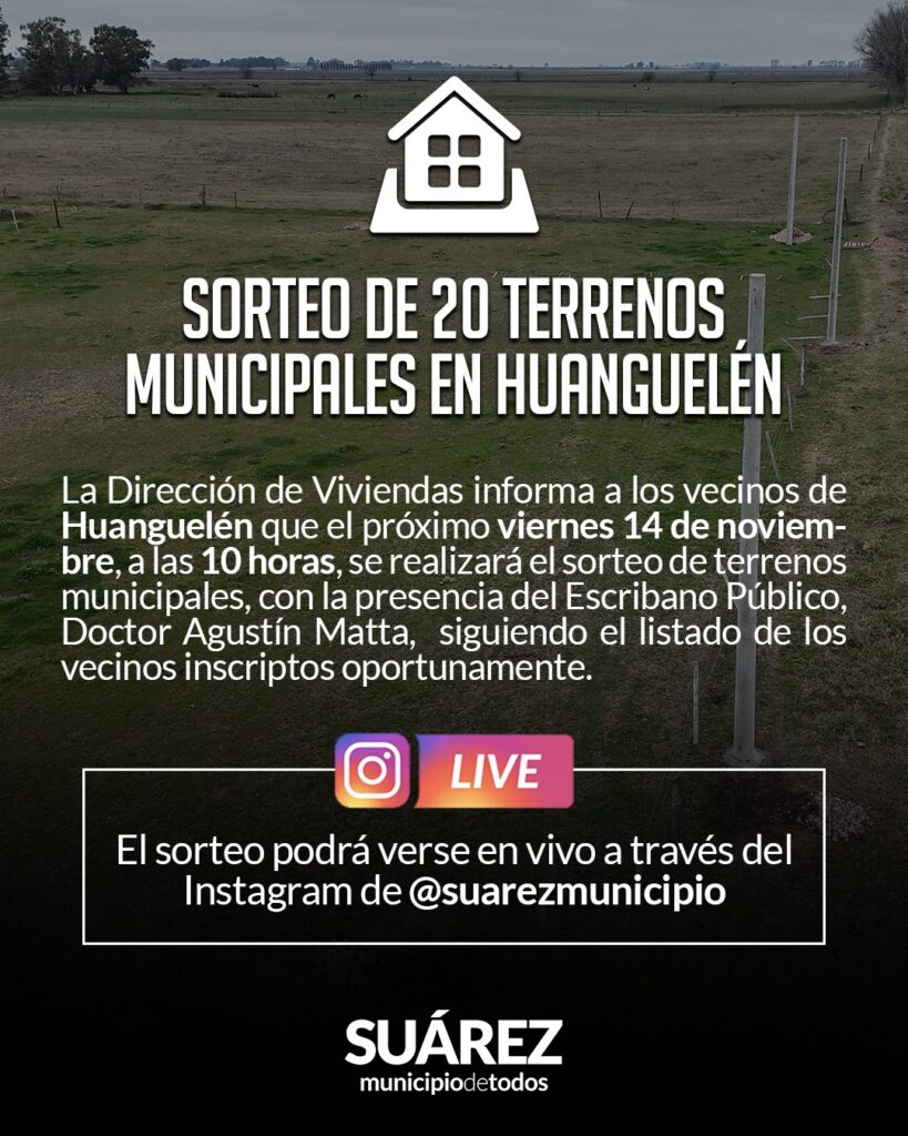 El sorteo podrá verse en vivo a través del Instagram oficial del Municipio de Coronel Suárez. De esta manera, la Gestión de Gobierno del Intendente Ricardo Moccero continúa cumpliendo con Huanguelén, impulsando políticas de adjudicación de terrenos que permiten que más familias puedan acceder al sueño de la vivienda propia. / Municipio de C. Suárez