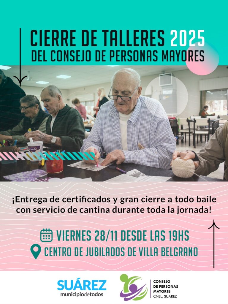 Gran cierre de talleres 2025 del consejo de personas mayores el viernes 28 de noviembre desde las 19:00 hs. en el Centro de Jubilados Villa Belgrano. El Consejo de Personas Mayores invita a compartir una hermosa tarde-noche de celebración con motivo del cierre de los talleres 2025, donde se realizará la entrega de certificados a todos los asistentes que formaron parte de las actividades de este año. ¡Ademas gran cierre a todo baile y servicio de cantina durante toda la jornada!. / Municipio de C. Suárez