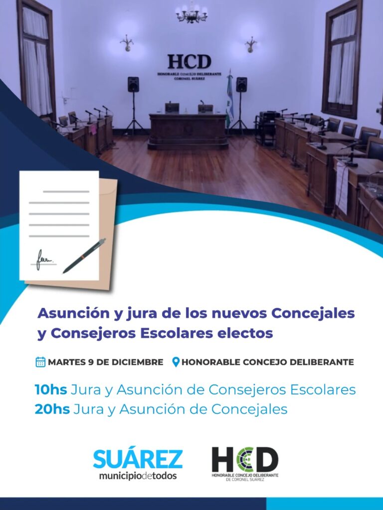 Asunción y jura de los nuevos Consejeros Escolares y Concejales electos. El Municipio de Coronel Suárez informa que el próximo martes 9 de diciembre se realizarán las ceremonias oficiales de jura y asunción de las autoridades electas en las elecciones legislativas de septiembre 2025, tal cual lo dispone la Junta Electoral Bonaerense.