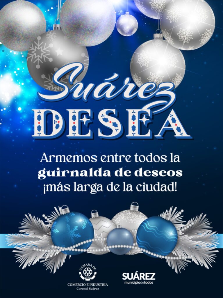La Cámara de Comercio de Coronel Suárez, con el acompañamiento del Municipio, presenta “Suárez Desea”, una propuesta pensada para volver al verdadero espíritu navideño: reencontrarnos, desearnos lo mejor y recordar que cada esperanza tiene valor cuando se comparte. Este año, invitamos a toda la comunidad a ser parte de un gesto simple, simbólico y lleno de magia: construir juntos la Guirnalda de Deseos más larga de Coronel Suárez, un mensaje colectivo de unidad, buenos augurios y sueños compartidos. Cada palabra escrita, cada deseo sincero, cada anhelo puesto en una tarjeta será un hilo más de esta gran guirnalda que nos abraza como pueblo y que refleja que, cuando sumamos voluntades, creamos comunidad.