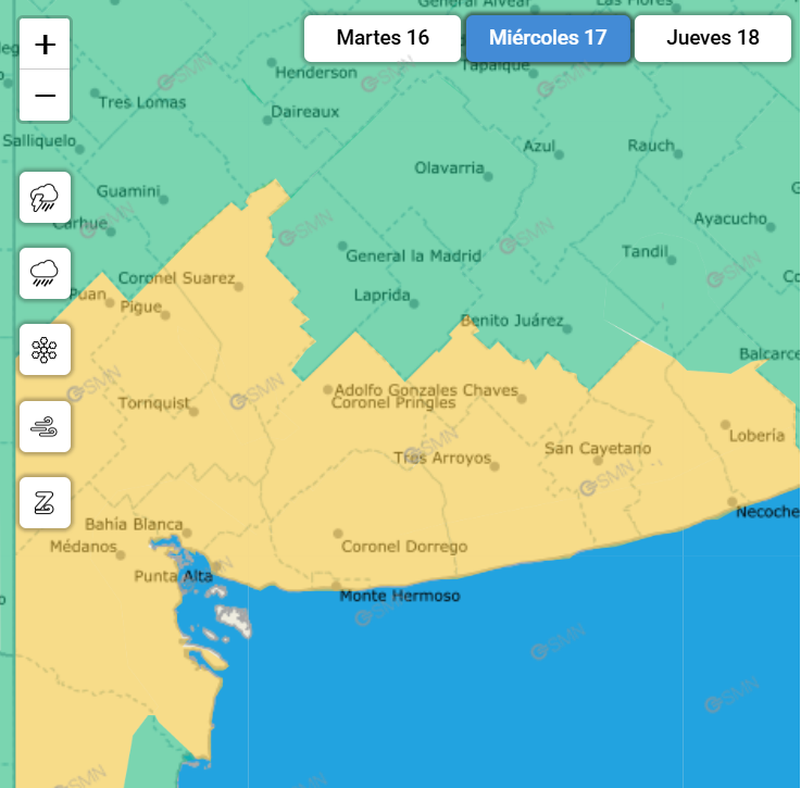 El Servicio Meteorológico Nacional (SMN) emitió este martes 16 de diciembre de 2025 un alerta amarilla por vientos fuertes que afecta a amplias zonas del sudoeste de la provincia de Buenos Aires y sectores del sur regional.