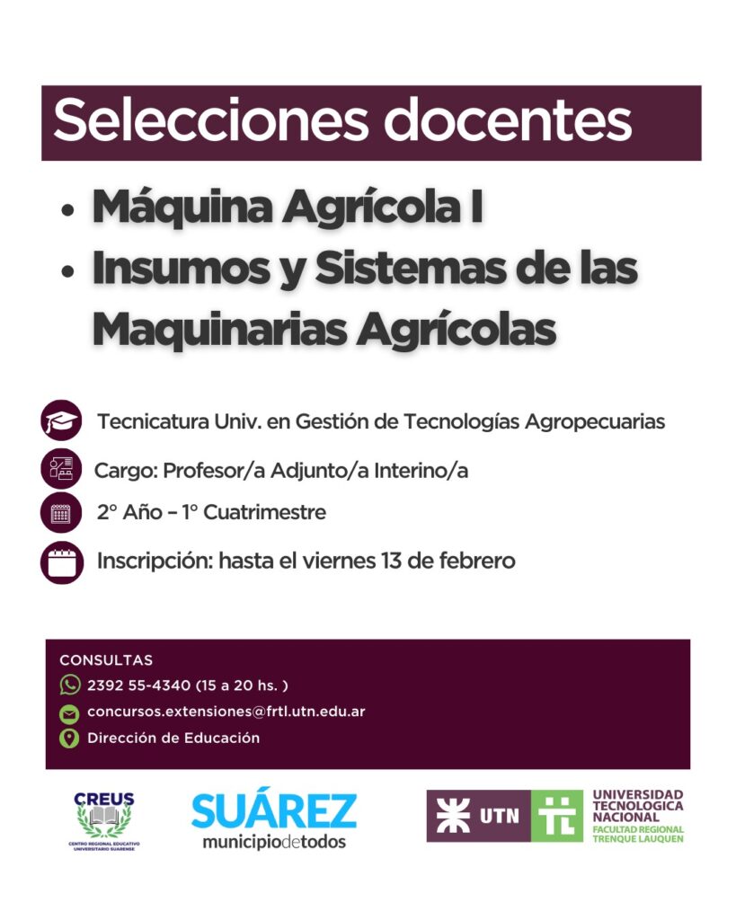 Se encuentran abiertas las inscripciones para la cobertura de cargos docentes en la Tecnicatura Universitaria en Gestión de Tecnologías Agropecuarias.