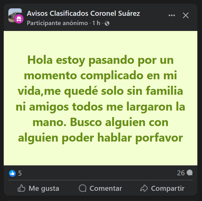 En ese contexto, las redes sociales se transforman, paradójicamente, en espacios donde se busca la contención que no aparece en otros ámbitos. Publicaciones anónimas, mensajes breves y pedidos desesperados evidencian una necesidad que no siempre encuentra respuesta.