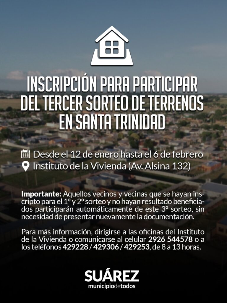 Para más información, dirigirse a las oficinas del Instituto de la Vivienda (av. Alsina 132) o comunicarse al celular 2926 544578 o a los teléfonos 429228 / 429306 / 429253, de 8 a 13 horas. / Municipio de C. Suárez