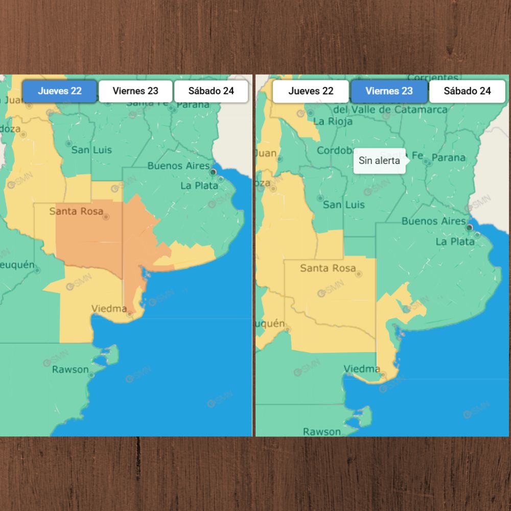 Viernes: alerta amarilla por tormentas fuertes. Para el viernes 23, el SMN mantiene un alerta amarillo, indicando la persistencia de tormentas de variada intensidad, algunas localmente fuertes, durante la noche.