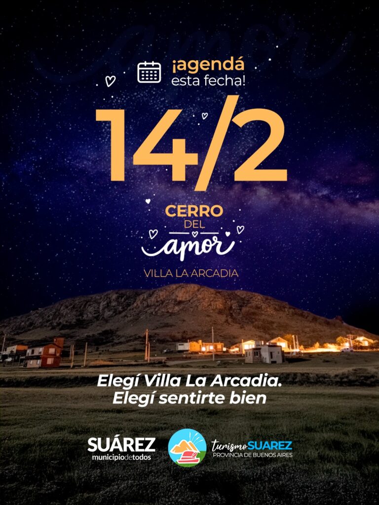 El Festival Cerro del Amor no será sólo un evento: será una experiencia que celebre el romance, la amistad, el encuentro y la identidad serrana, consolidando a Villa La Arcadia como un destino para sentir, disfrutar y volver. Este 14 de febrero en el Cerro del Amor – Villa La Arcadia. Viví la leyenda. Elegí Villa La Arcadia. Elegí sentirte bien. / Municipio de C. Suárez