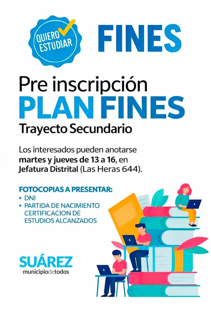 Pre inscripción a Plan Fines. Si querés terminar tus estudios secundarios, esta es tu oportunidad. Martes y jueves de febrero. Jefatura Distrital, en Las Heras 644. Horario: de 13 a 16 horas. Acercate con tu DNI, partida de nacimiento y certificación de estudios alcanzados. ¡Animate a terminar el secundario con FINES! / Municipio de C. Suárez