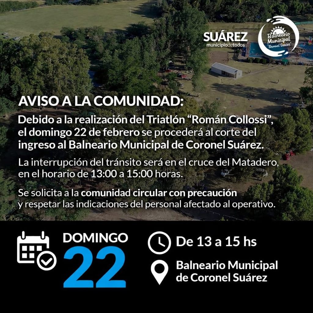 La Municipalidad de Coronel Suárez informó a la comunidad que el próximo domingo 22 de febrero se realizará un corte en el ingreso al Balneario Municipal, con motivo de la disputa del Triatlón “Román Collossi”.
