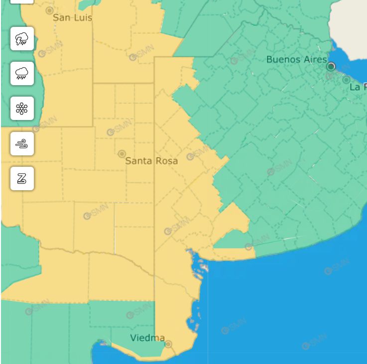 El alerta comprende al norte de Bahía Blanca; el oeste de Patagones y Villarino; además de los distritos de Puan; zona baja de Coronel Pringles; zona baja de Coronel Suárez; zona baja de Saavedra; y zona baja de Tornquist.