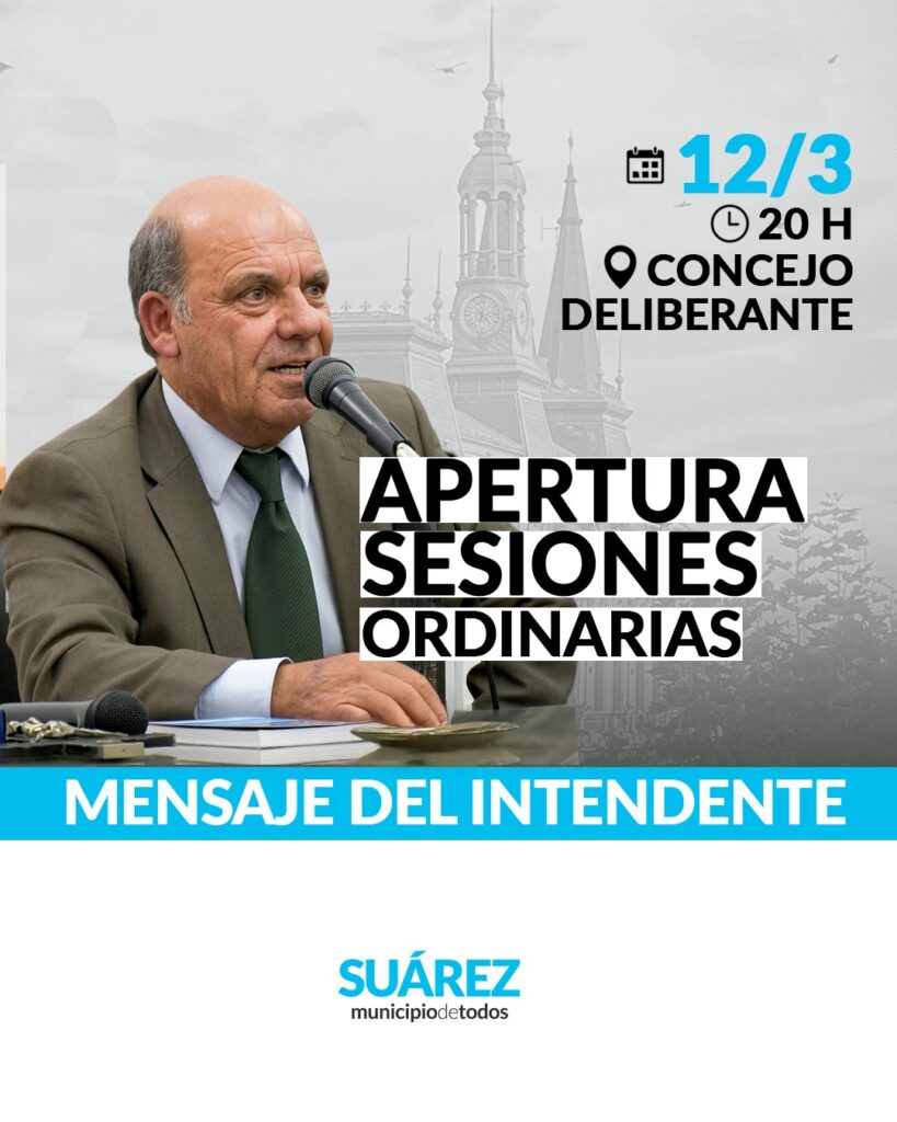 El Intendente Ricardo Moccero inaugurará el período de sesiones ordinarias del Concejo Deliberante. Se invita a vecinos y vecinas, instituciones y fuerzas vivas de la comunidad del distrito a participar de la SESIÓN ESPECIAL, en la sala del Honorable Concejo Deliberante, este jueves 12 de marzo, a las 20:00, ocasión en que se dejará inaugurado el período de Sesiones Ordinarias, con el mensaje del Intendente Municipal, Ricardo Alejo Moccero. / Municipio de C. Suárez