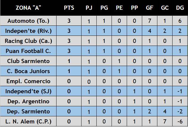 En la Zona “A”, Independiente de San José no pudo sumar en su visita a Racing Club de Carhué, mientras que Boca Juniors de Coronel Suárez rescató un empate en su presentación frente a Club Sarmiento de Pigüé. Por su parte, Deportivo Sarmiento protagonizó un partido con muchos goles ante Independiente de Rivera, aunque no logró quedarse con los puntos. La jornada del grupo también incluyó el triunfo de Puan Football Club frente a Deportivo Argentino de Pigüé y la amplia victoria de Automoto de Tornquist ante Leandro N. Alem de Coronel Pringles. Empleados de Comercio de Guaminí tuvo fecha libre.