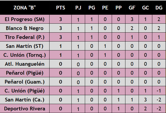 En la Zona “B”, El Progreso de Santa María tuvo un estreno muy positivo al imponerse frente a San Martín de Carhué, mientras que Blanco y Negro también comenzó el certamen con victoria gracias a la destacada actuación goleadora de Juan Ullmann ante Deportivo Rivera. En tanto, San Martín de Santa Trinidad igualó sin goles frente a Unión de Tornquist y Tiro Federal de Puan se quedó con el triunfo en su visita a Unión de Pigüé.