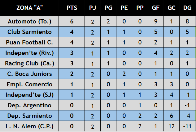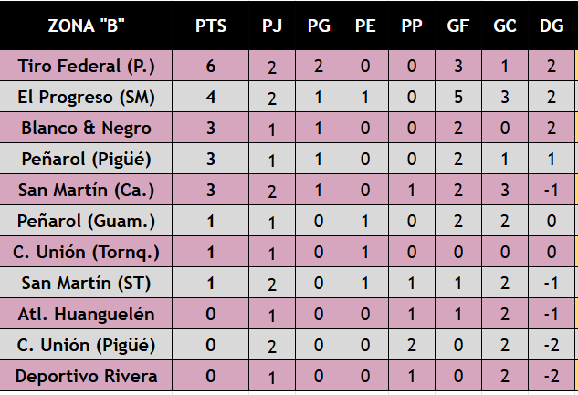 Nota: en las siguientes tablas de posiciones no se incluyen resultados entre Atl. Huanguelén — Peñarol (Pigüé), ya que tienen pendiente su partido de la fecha 1, Dep. Argentino — Racing Club (Ca.) y C. Unión (Tornq.) — Blanco & Negro quienes tienen su partido pendiente de este domingo por la fecha 2.