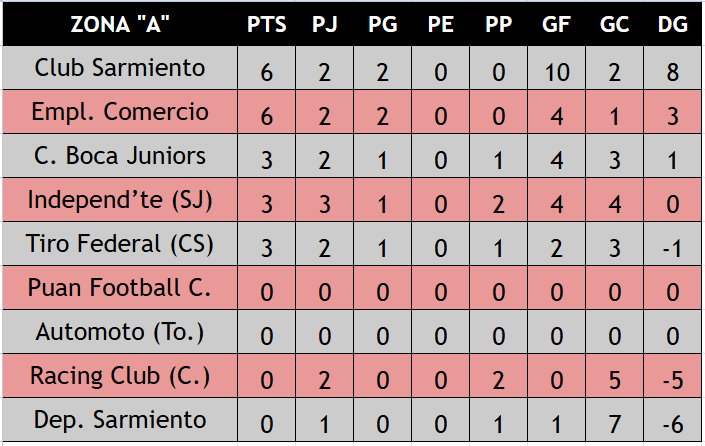 Nota: en las tablas de posiciones no se incluyen resultados entre Dep. Sarmiento — Automoto (To.) y C. Boca Juniors — Puan Football C. quienes tienen su partido pendientepor la fecha 2.