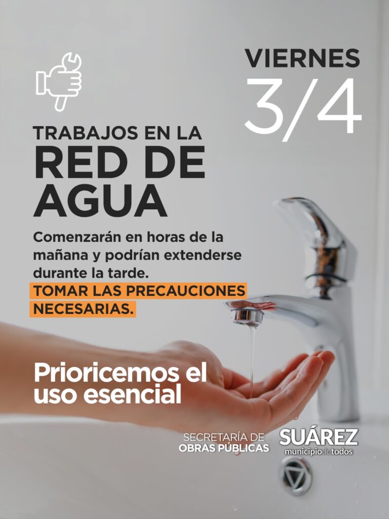 Intervención en la red de agua potable: mientras se realizan los trabajos, prioricemos el uso esencial. La Secretaría de Obras Públicas informa que este VIERNES 3 de abril se realizarán tareas de mantenimiento y optimización en el sistema de agua potable, en un sector de la red ubicado sobre calle Las Heras al 1100.