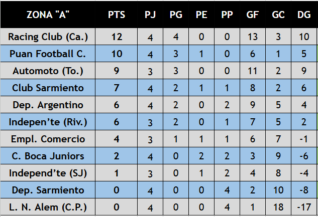 L. N. Alem (C.P.) 0 (-) — Racing Club (Ca.) 4 (Tiziano Clatt, Marcos Garcia e/c, Ramiro Palacio 2).