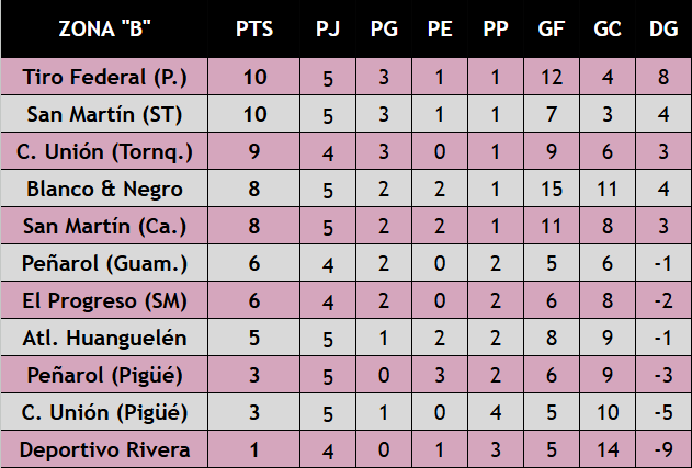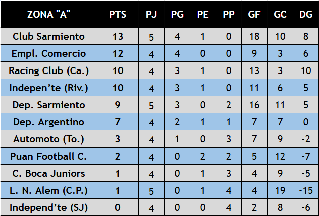 Nota: en las tablas de posiciones siguientes no se incluyen resultados entre Dep. Argentino — Racing Club (Ca.) y C. Unión (Tornq.) — Blanco & Negro quienes tienen su partido pendiente por la fecha 2.