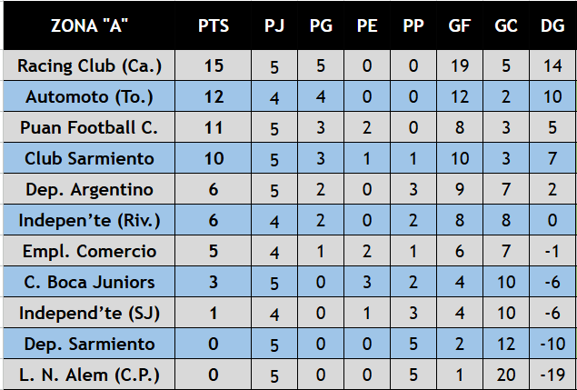 El resto de la jornada también dejó resultados destacados: Racing Club de Carhué se impuso en su compromiso frente a San Martín de Carhué, Puan Football Club y Tiro Federal de Puan repartieron puntos en un encuentro parejo, y Club Sarmiento de Pigüé logró quedarse con el duelo ante Peñarol de Pigüé.