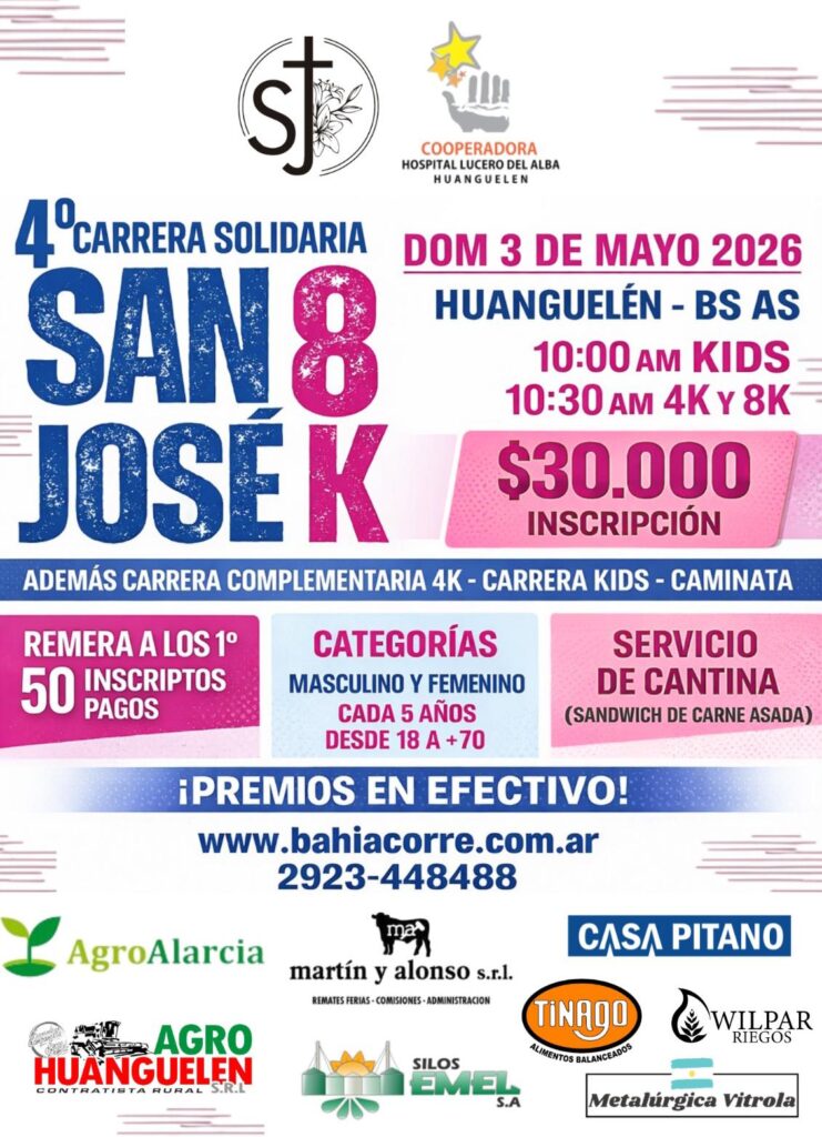 Se viene la 4° Carrera Solidaria San José 8K en Huanguelén el dia domingo 3 de mayo. Con el deporte como motor y la solidaridad como bandera, la comunidad de Huanguelén se prepara para vivir una jornada especial.