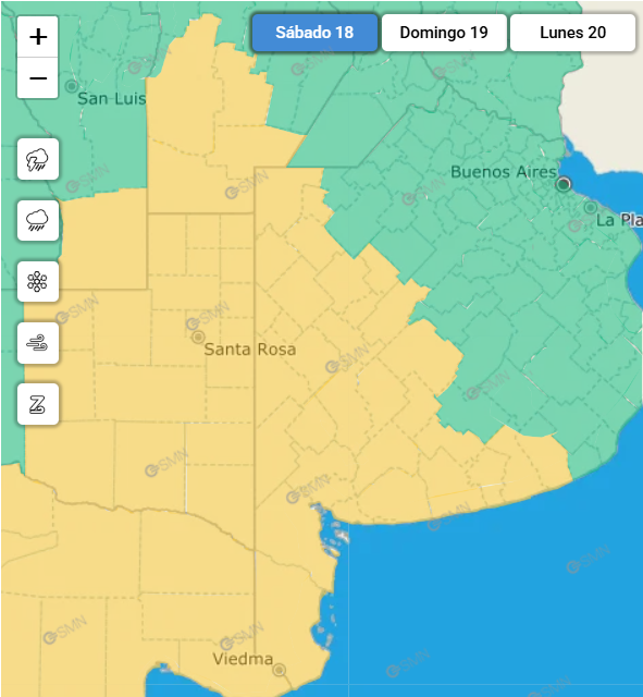 El Servicio Meteorológico Nacional (SMN) emitió un nuevo alerta amarillo para la tarde-noche de este sábado 18 de abril, abarcando una amplia zona del sudoeste bonaerense que incluye el norte de Bahía Blanca, el oeste de Patagones y Villarino, además de los distritos de Puan y sectores bajos de Coronel Pringles, Coronel Suárez, Saavedra y Tornquist.