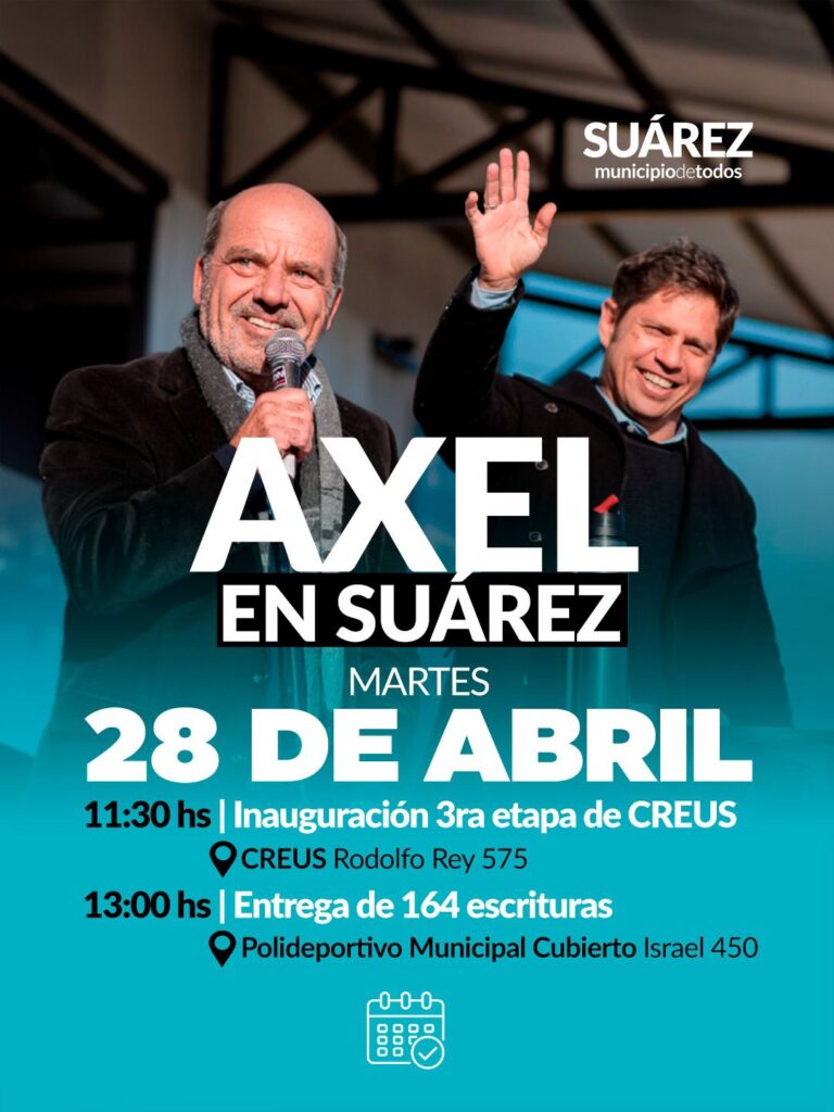 Kicillof llega a Suárez: obras, educación, escrituras y más inversión para el desarrollo local. El gobernador de la provincia de Buenos Aires, Axel Kicillof, visitará Coronel Suárez junto a gran parte de su Gabinete Provincial para compartir con el intendente Ricardo Moccero, una jornada de trabajo que pondrá en valor la inversión en educación, infraestructura, producción y derechos para las familias del distrito.
